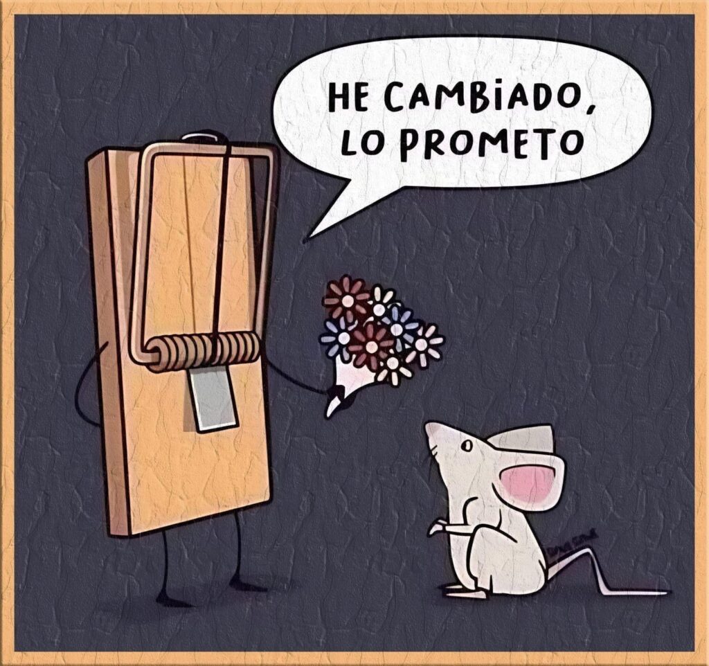 En la ilustración vemos a una ratonera que, con flores en mano, le promete a un ratón: “He cambiado, lo prometo”. La escena es tierna y absurda al mismo tiempo, porque todos sabemos que, aunque la ratonera se disfrace de romántica, su naturaleza sigue siendo la misma: una trampa.